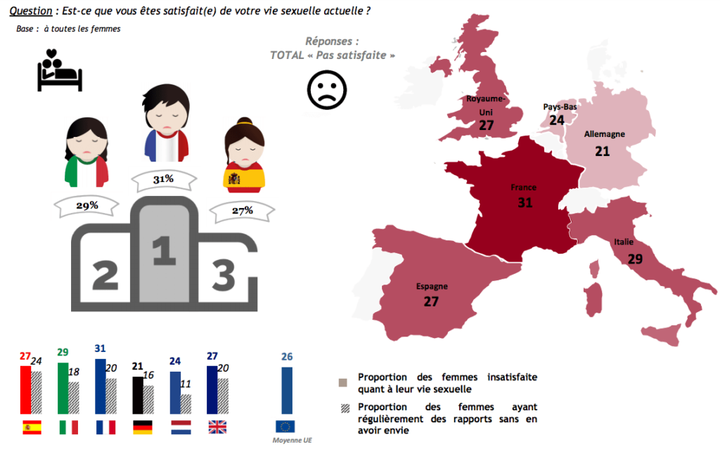 Si l’étude citée précédemment concerne les femmes australiennes, il semble bien que les Européennes soient logées à la même enseigne en ce qui concerne l’envie de sexe. Relayée par nos confrères du Huffington Post, cette étude menée par l’institut de sondages Ifop se penche sur la satisfaction de plus de 6000 femmes d’Europe (Espagne, Italie, France, Allemagne, Pays-Bas, Royaume-Uni). Celles qui sont le plus insatisfaites représentent 31% des femmes interrogées et sont…Françaises. Elles précèdent les Italiennes (29%) et les Espagnoles (27%). 20% des premières à être insatisfaites ont déclaré avoir des rapports sexuels sans en avoir envie.