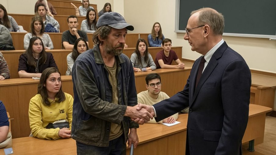 Les regards se perdent, cherchant l’homme dont il parle. Et puis, le doyen tend la main… vers Julien. Stupeur. L’homme en bleu de travail serait le bienfaiteur derrière des dizaines de bourses d’études ? Élise, une étudiante, se mord les lèvres. Elle se souvient de son regard moqueur quelques minutes plus tôt.