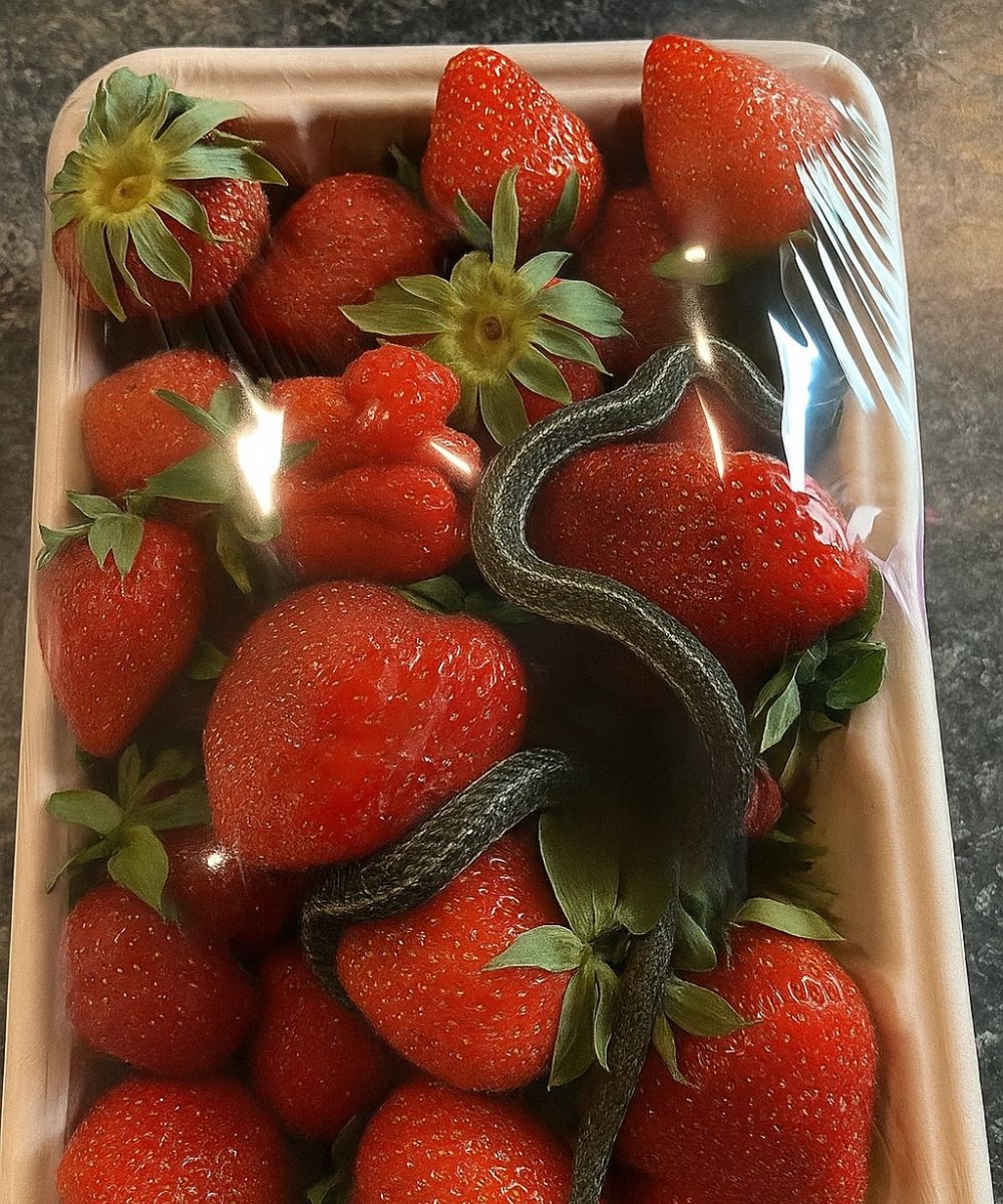 Au milieu de ces fraises appétissantes, se dessinait une forme allongée qui contrastait étrangement avec le reste du contenu. Mon premier réflexe a été de penser à un simple résidu d’emballage ou peut-être une ficelle oubliée lors de la mise en barquette. Mais alors que j’observais plus attentivement, un détail m’a immédiatement alertée : l’objet semblait animé d’un mouvement presque imperceptible. Une légère oscillation, subtile mais bien réelle, suffisante pour éveiller mes suspicions.