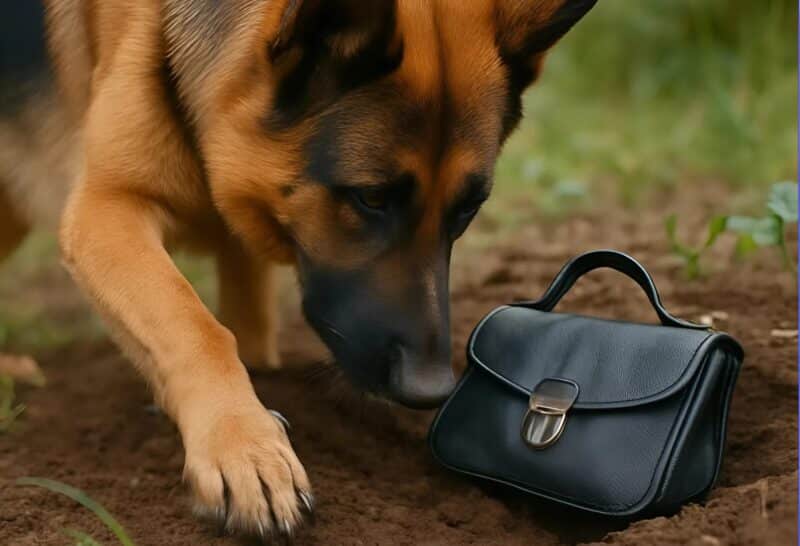 Soudain, son attitude changea complètement : museau rivé au sol, posture tendue, toute son attention concentrée sur un point invisible. En m’approchant, je distinguai la forme partiellement enterrée d’un sac en cuir sombre, visiblement dissimulé avec intention.