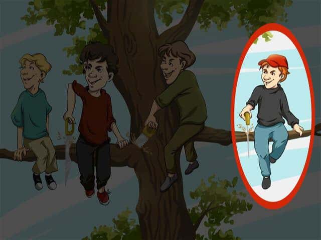Si vous avez identifié le garçon au bonnet rouge (numéro 4) comme celui qui commet la plus lourde faute, félicitations ! C’est effectivement lui qui réalise la méprise la plus patente. Il entame directement la branche qui le soutient, ce qui le voue inéluctablement à une chute.