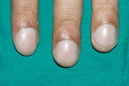 - Une teinte modifiée : des ongles particulièrement pâles ou tirant sur le bleu peuvent traduire une hypoxémie.