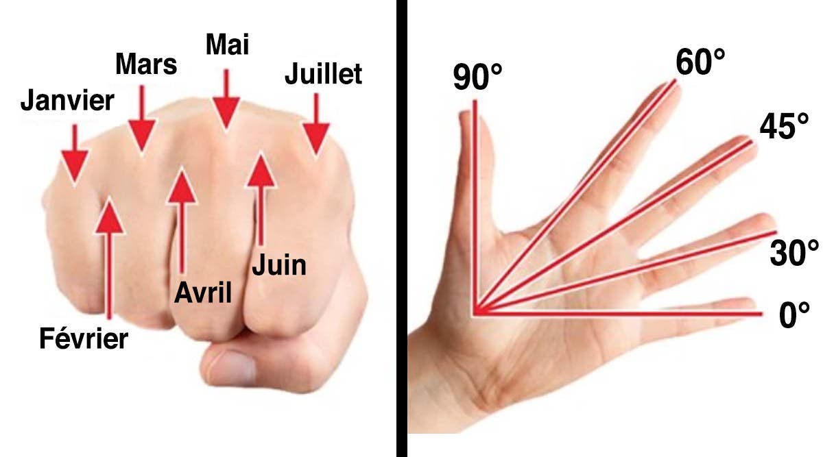 16.Si vous souhaitez savoir quel mois a 31 jours, fermez le poing gauche et comptez les mois en vous fiant aux bosses et aux creux de l’auriculaire à l’index. Chaque bosse représente un mois à 31 jours, tandis que le creux représente un mois à 30 jours (ou moins quand il s’agit de février).