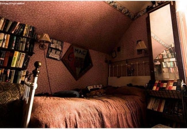 Comme la plupart des maisons de l’époque, l’une des chambres était entièrement recouverte de papier peint sombre. Sur le mur à côté du lit, des photos de classe et une bibliothèque remplie d’autres livres. Ça pourrait être la chambre du fils ? Que pouvez-vous imaginer d’autre sur la personnalité de ces personnes ?