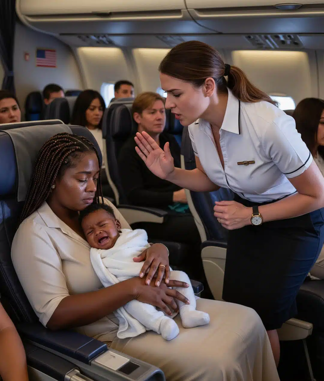 « Je vous prierais de faire taire votre enfant », interpella l’hôtesse avec impatience.