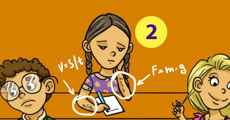 Avez-vous trouvé la réponse ? Sinon, observez bien la fille dans le fond, avez-vous remarqué qu’elle a inscrit des formules mathématiques sur son bras ? Si vous avez eu juste, trouver l’intrus dans cette image sera facile.