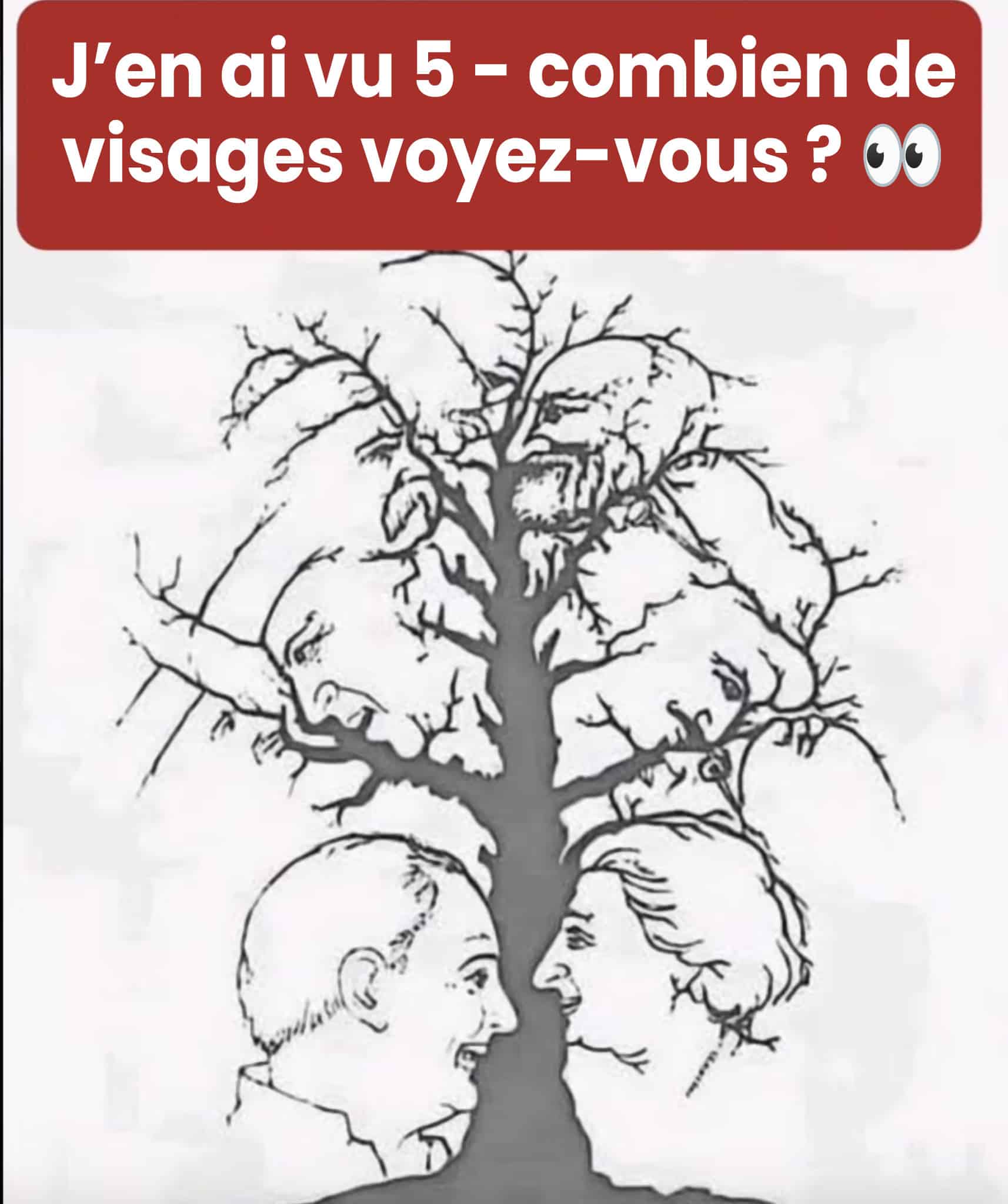 Cette image d'arbre cache bien plus qu'il n'y paraît. Un défi visuel amusant qui révèle comment votre cerveau interprète les formes. Êtes-vous prêt à compter les visages dissimulés ?