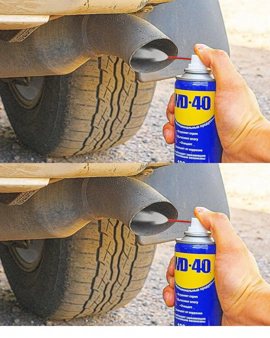 L’extrémité du pot d’échappement présente souvent un aspect terne et noirci. Appliquez une légère vaporisation de WD-40, patientez quelques instants, puis frictionnez avec un textile doux. Le résultat : un retour à l’aspect métallique originel en un clin d’œil.
